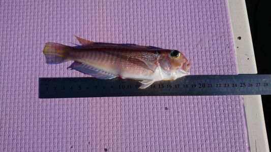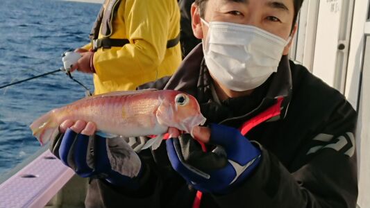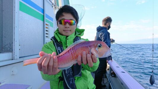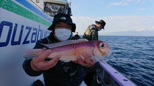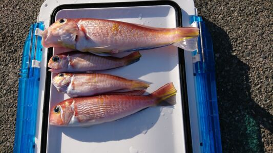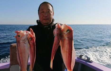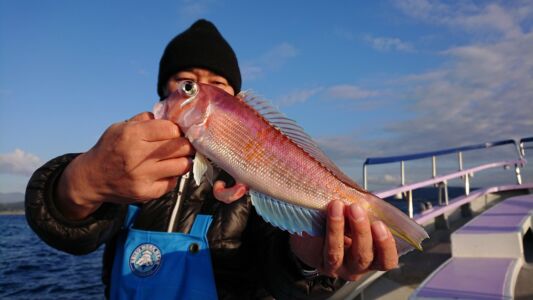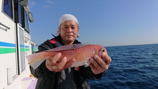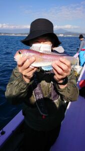 左舷胴では「アマダイ釣り初体験」という21歳の大学生の方が40㌢を超える良型を手にしていました。ちなみ筆者は右舷ミヨシ、最大30㌢で4匹ゲットという結果です。