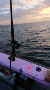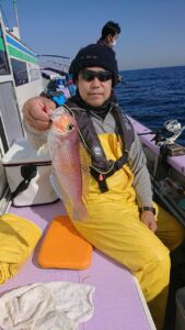 タナは底から1㍍、かけ上がりのポイントでは1・5㍍の指示。筆者は朝方と昼過ぎの納竿間際にアタリが集中しましたが、船内では終日誰かにポツリポツリのアタリが出る状況でした。