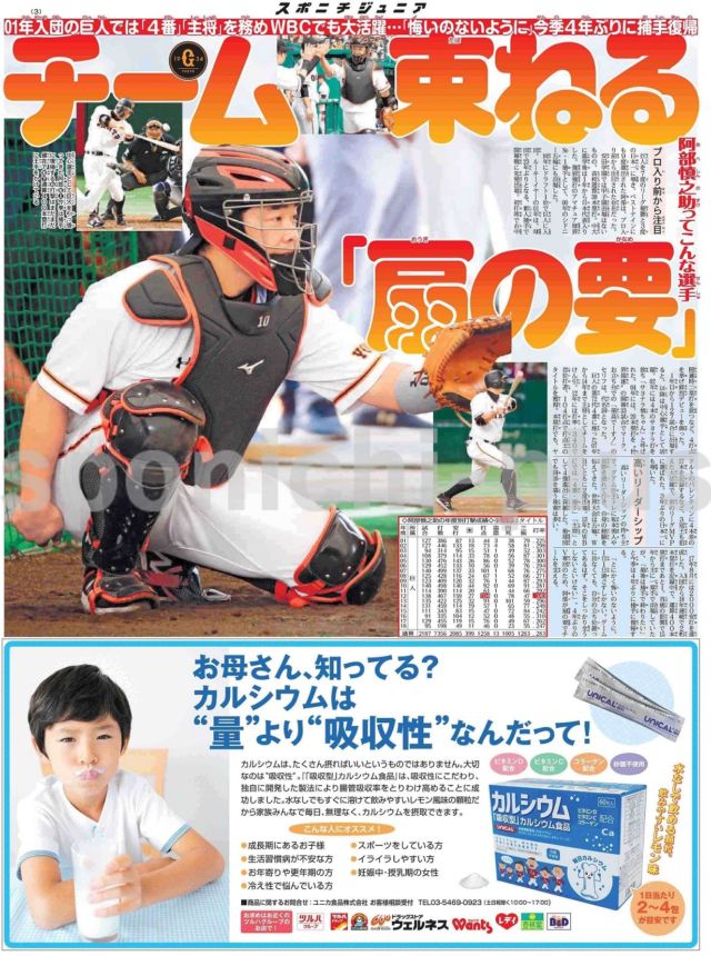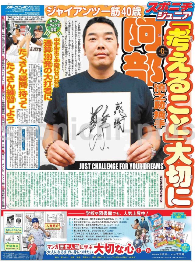 紙面は、プロ野球・巨人の阿部慎之助選手から小学生への熱いメッセージのほか、10年目に突入した女子プロ野球特集など盛りだくさんの内容でお届けしています。
