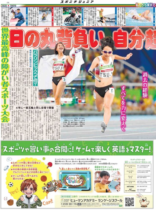 1面は 2020東京パラリンピックの出場を目指す陸上短距離の重本沙絵選手で、挑戦することの重要性を小学生に語っています。