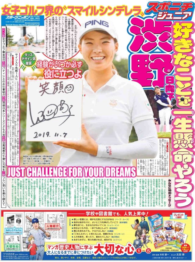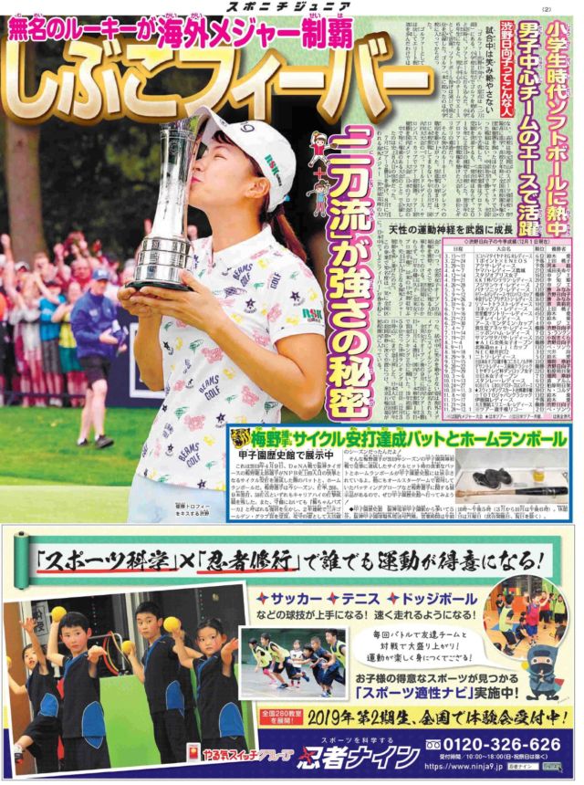 1面は 女子プロゴルファーの渋野日向子選手です。ルーキーながら海外メジャーの全英女子オープンで優勝。さらに国内でも4勝し今年の賞金ランキング2位に輝いた〝しぶこ〟が小学生にアドバイスを送っています。12月10日発行。