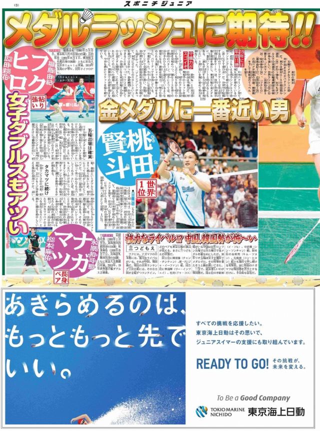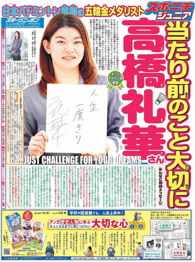 1面はリオ五輪バドミントン女子ダブルス金メダリスト高橋礼華さん(30)です。92年のバルセロナでバドミントンが正式種目に採用されてから24年、ついに日本勢が初の頂点に立ちました。高橋さんが小学生にアドバイスを送っています。