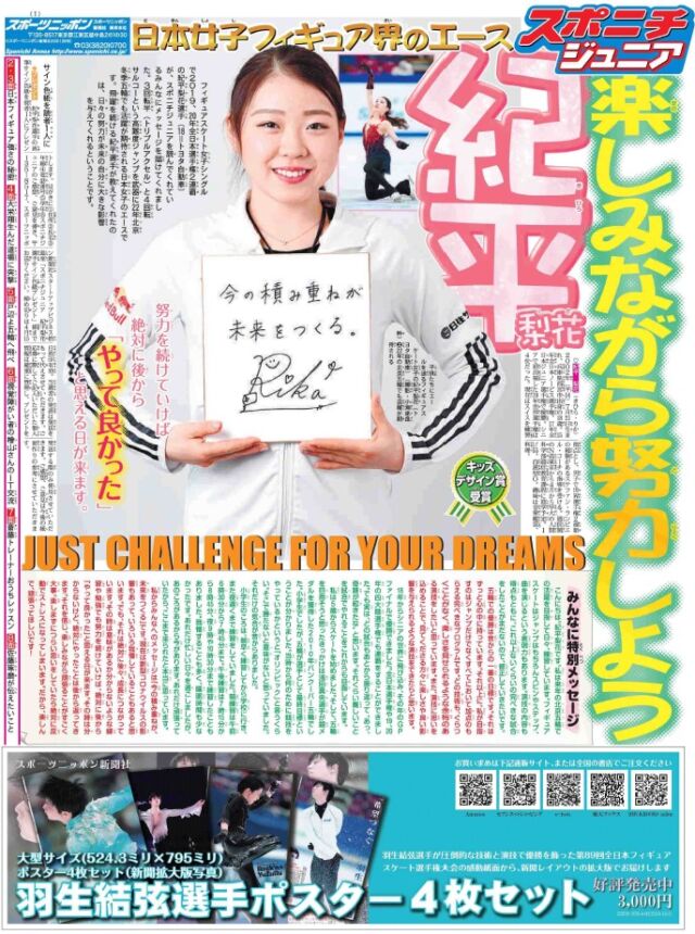1面はフィギュアスケート女子シングルで2019、20年の全日本選手権を連覇した紀平梨花選手。来年の北京五輪でも活躍が期待される日本女子のエースが小学生にアドバイスを送っています。